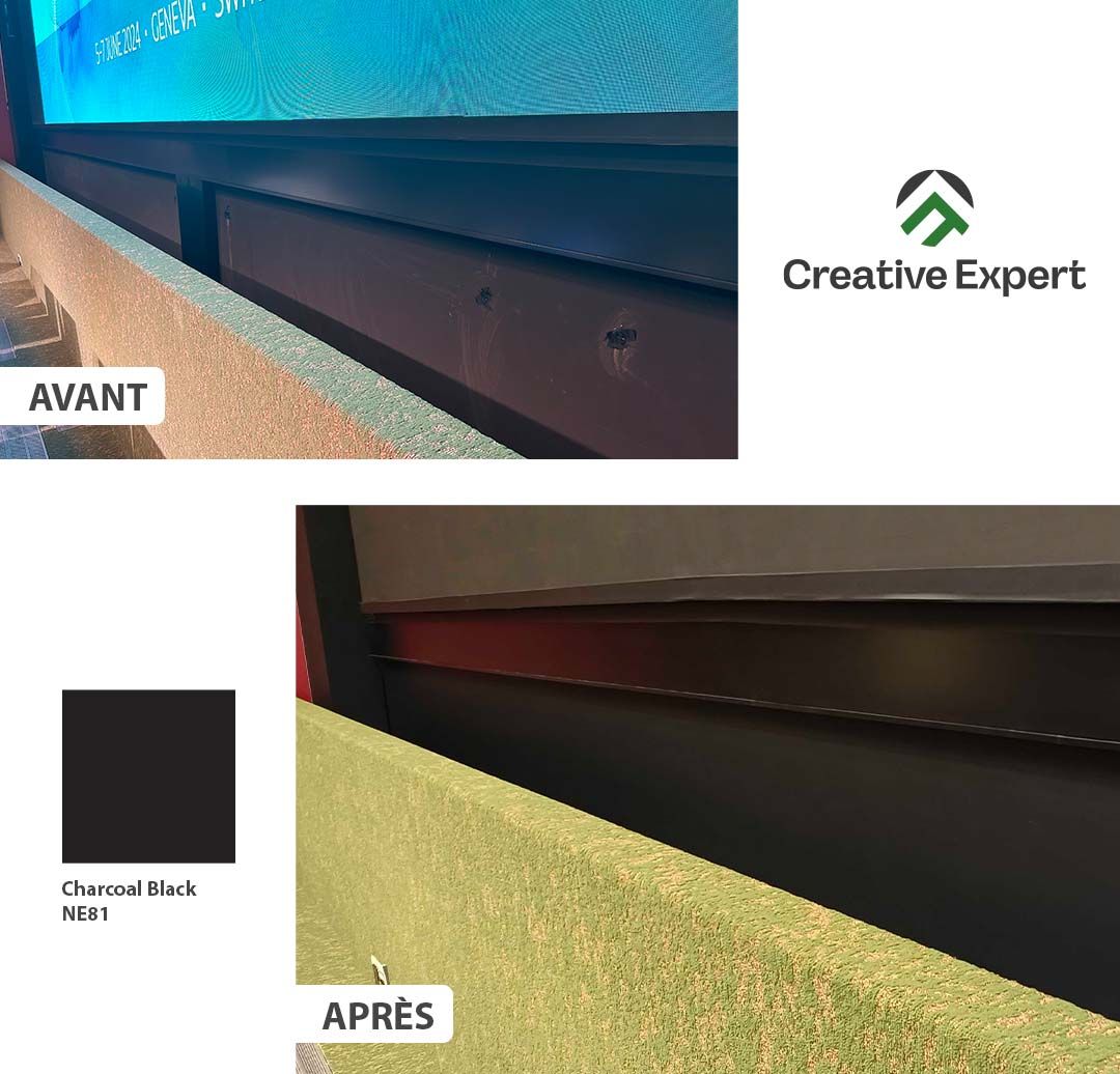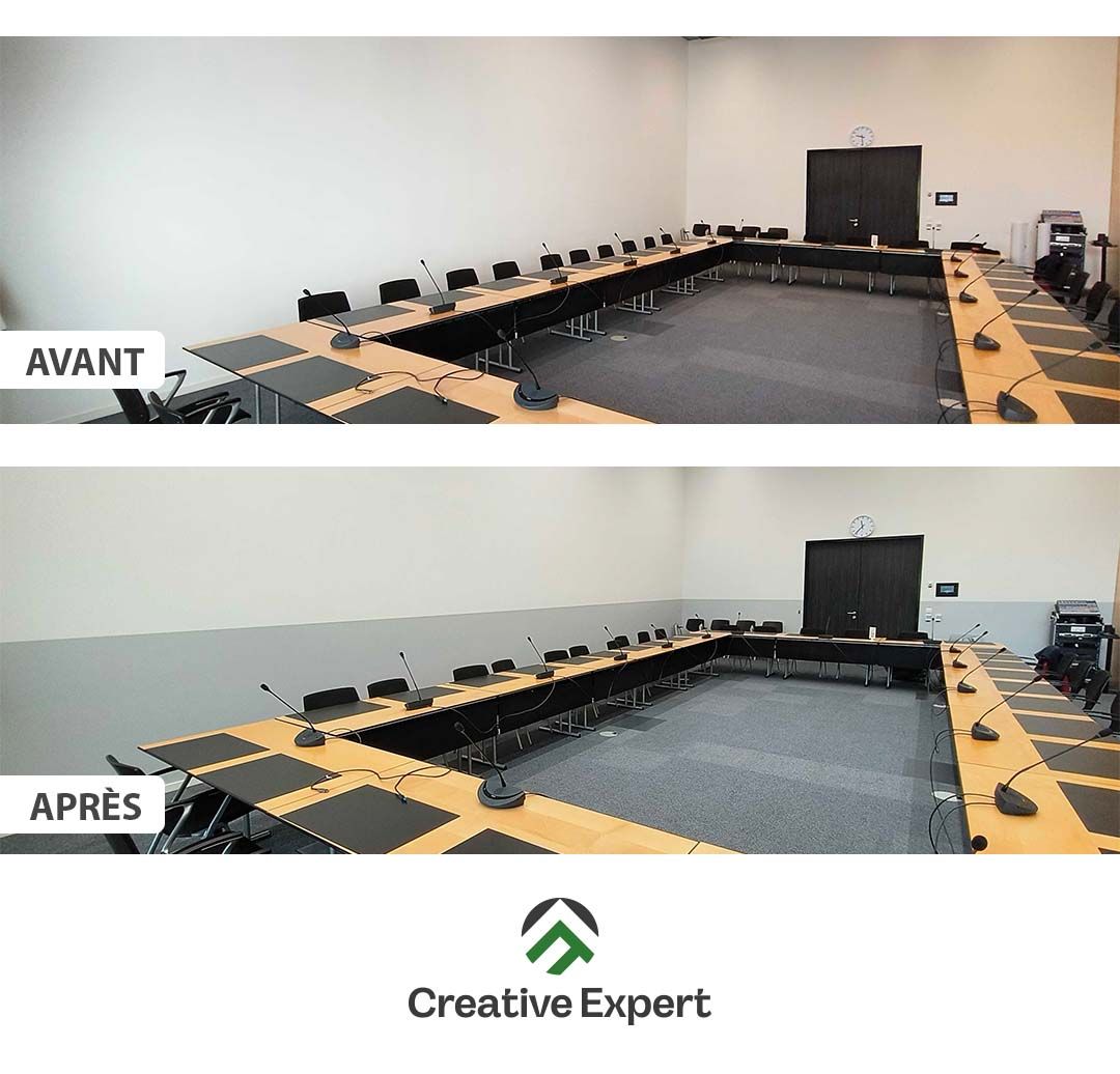 Rénovation de l'encradrement d'un écran géant et covering sur les murs d'une salle de conférence qui permet de les protéger des frotements des chaises chez FIPOI.