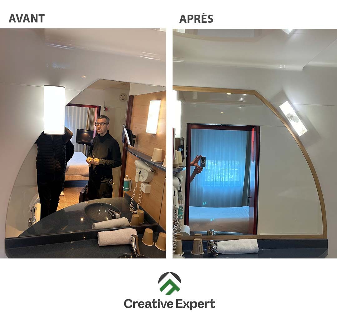Création d'un cadre de miroir dans les salles de bain de l'hôtel Ibis budget Genève Aéroport.