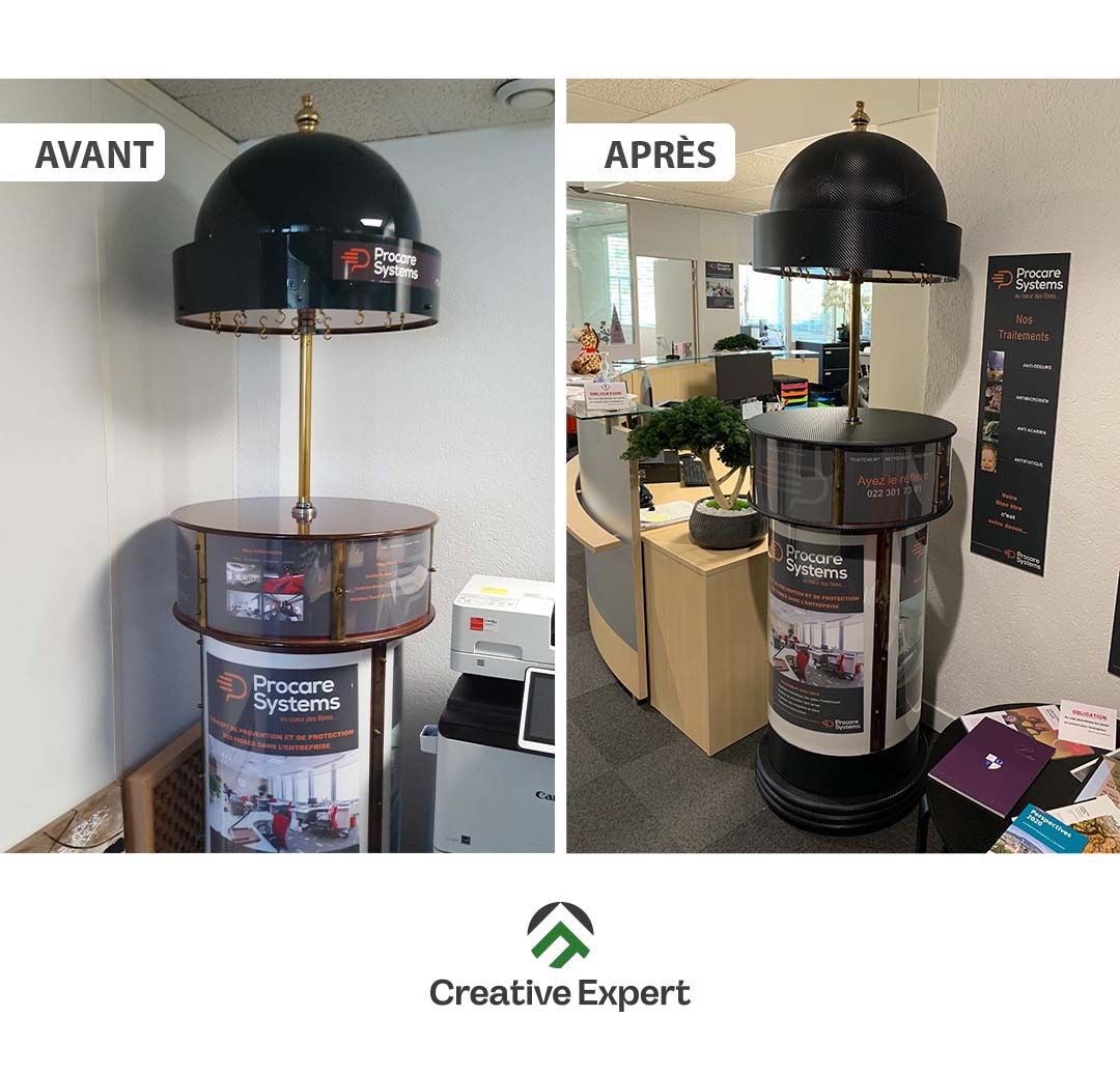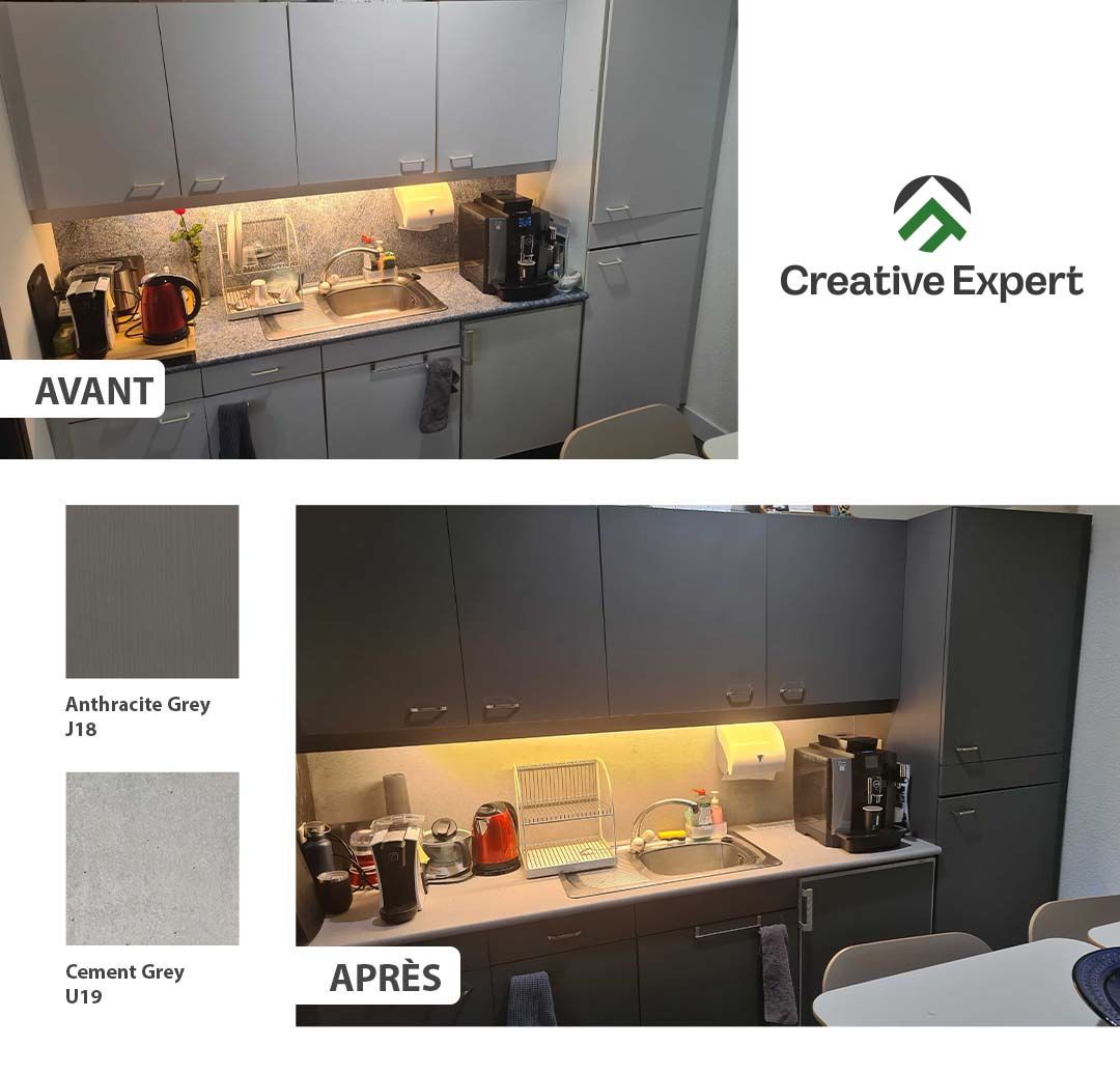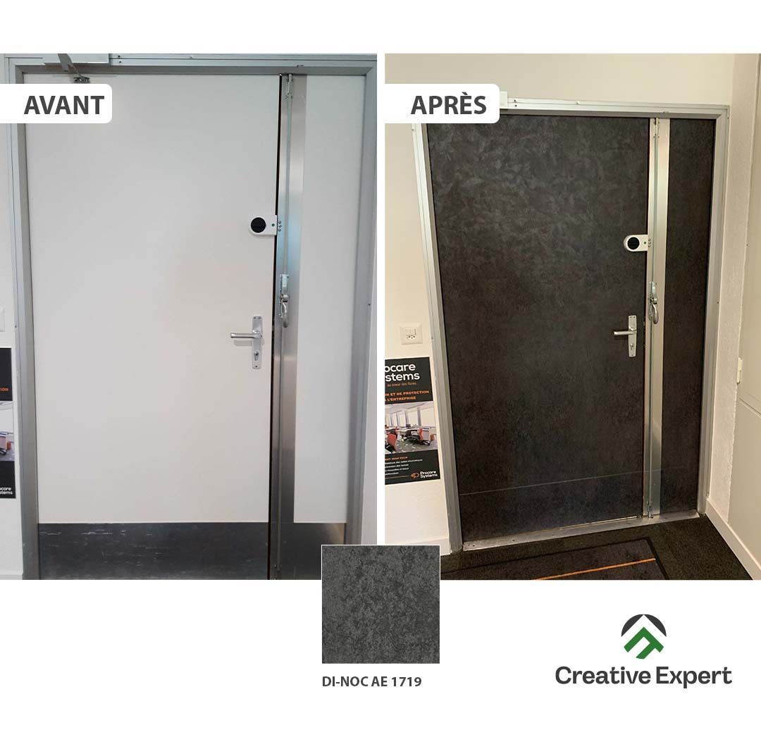 Covering effet carbone sur meuble mobile "porte-journaux", covering porte d'entrée et rénovation cuisine.