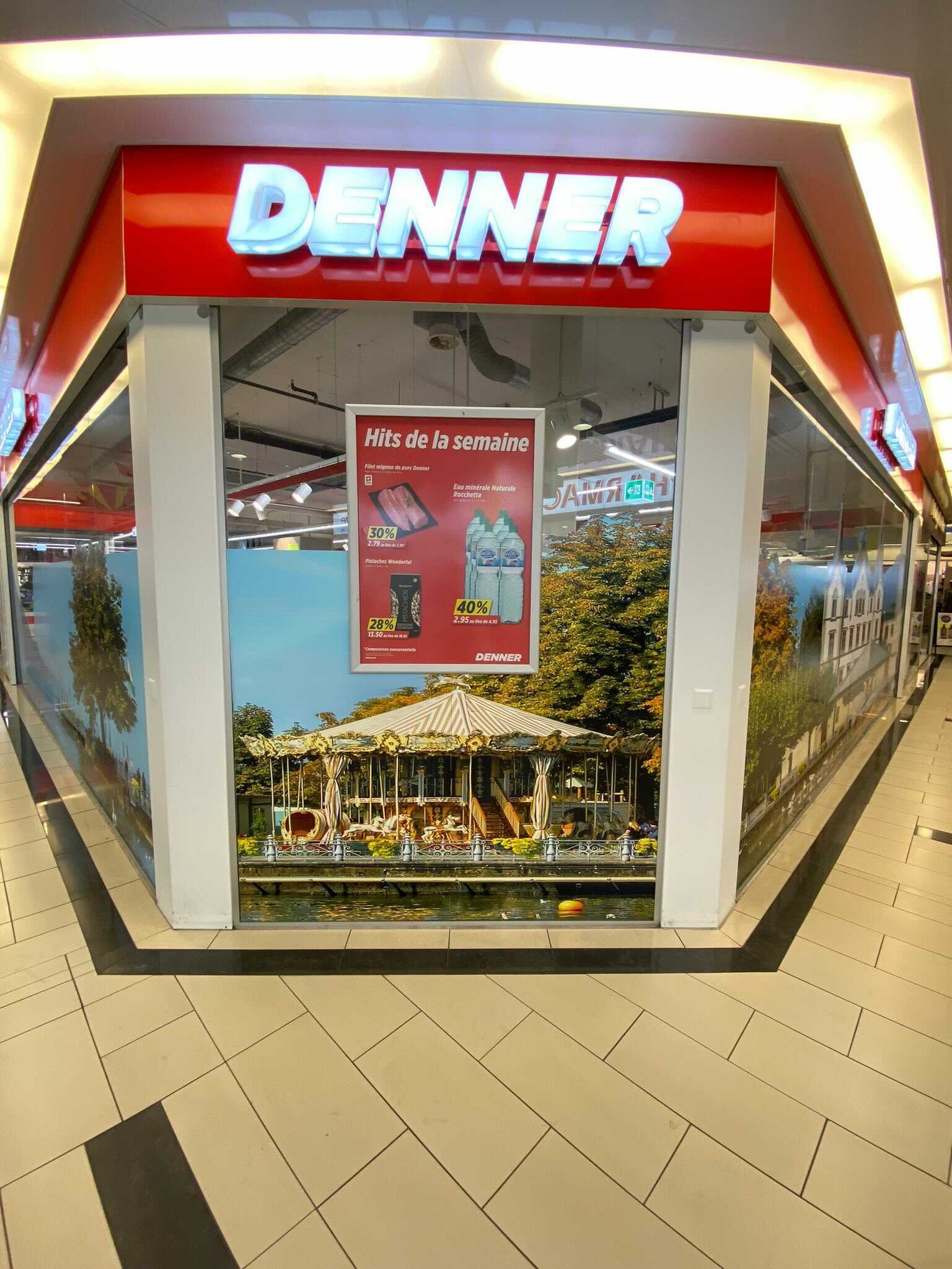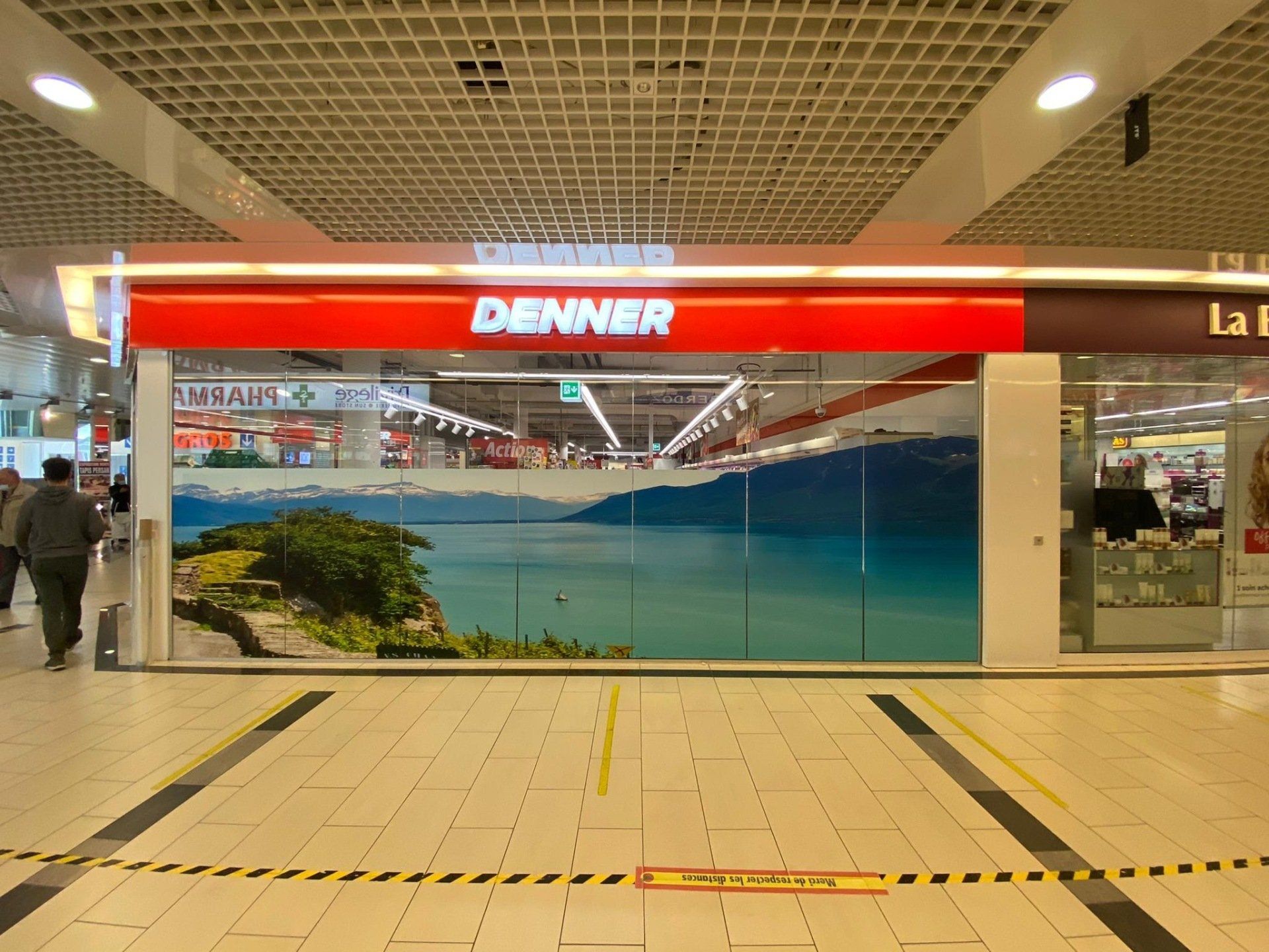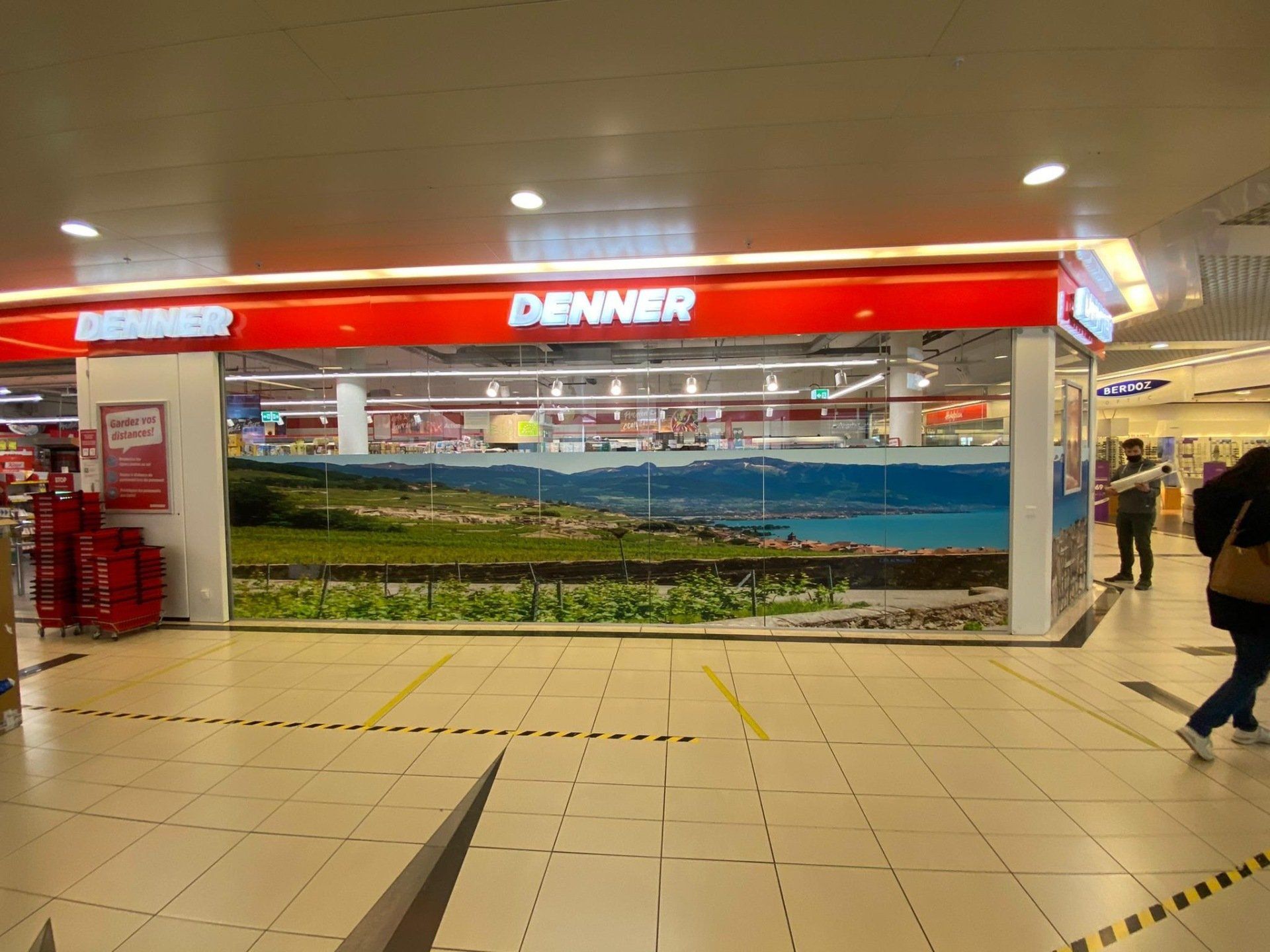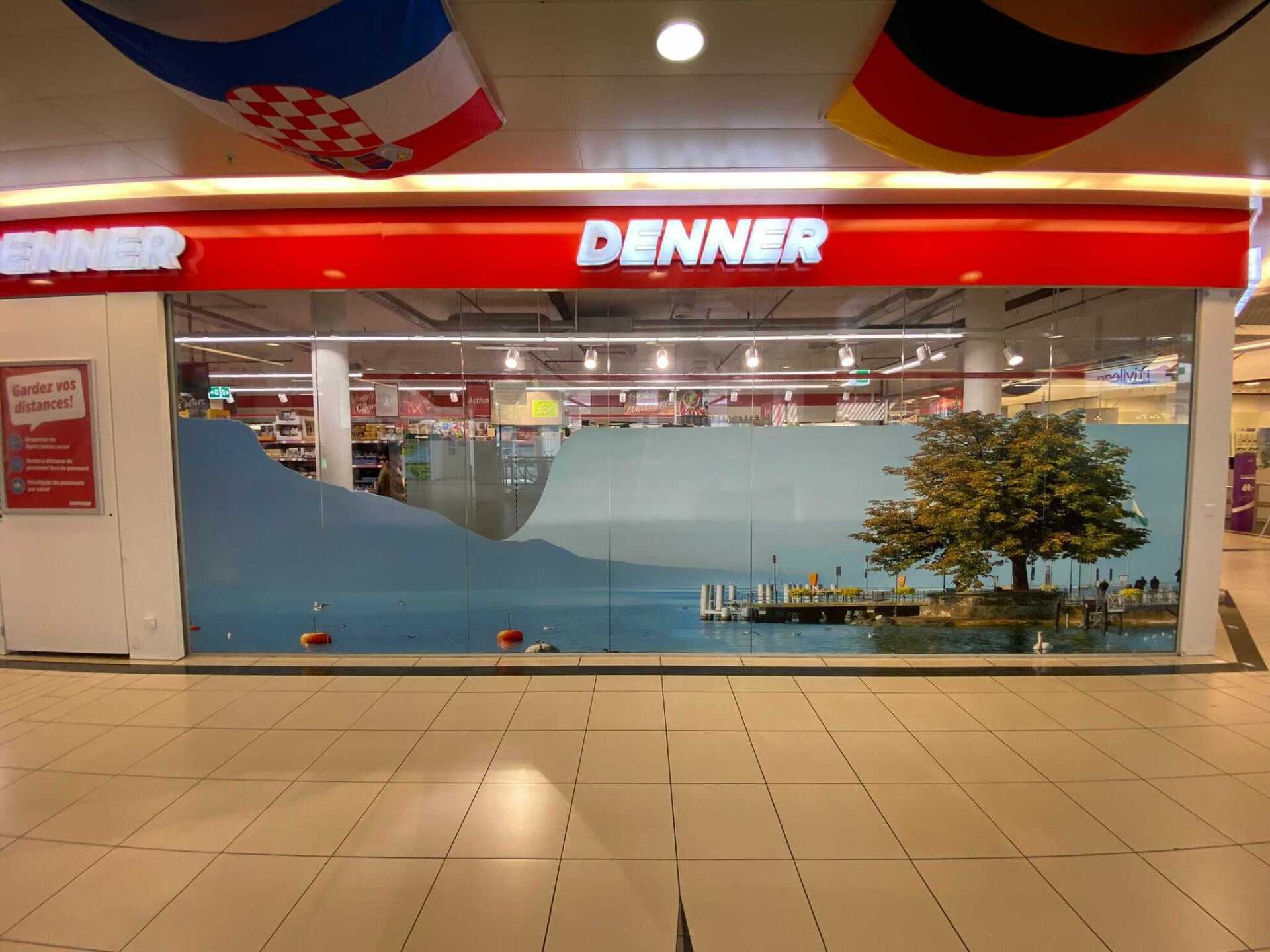 Covering en dépoli imprimé sur la vitrine d'un magasin Denner pour différents événements.