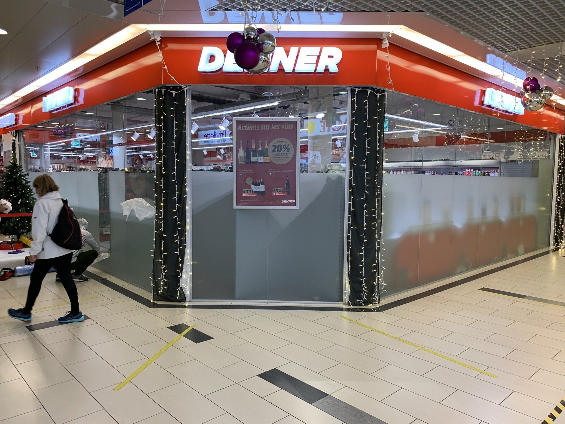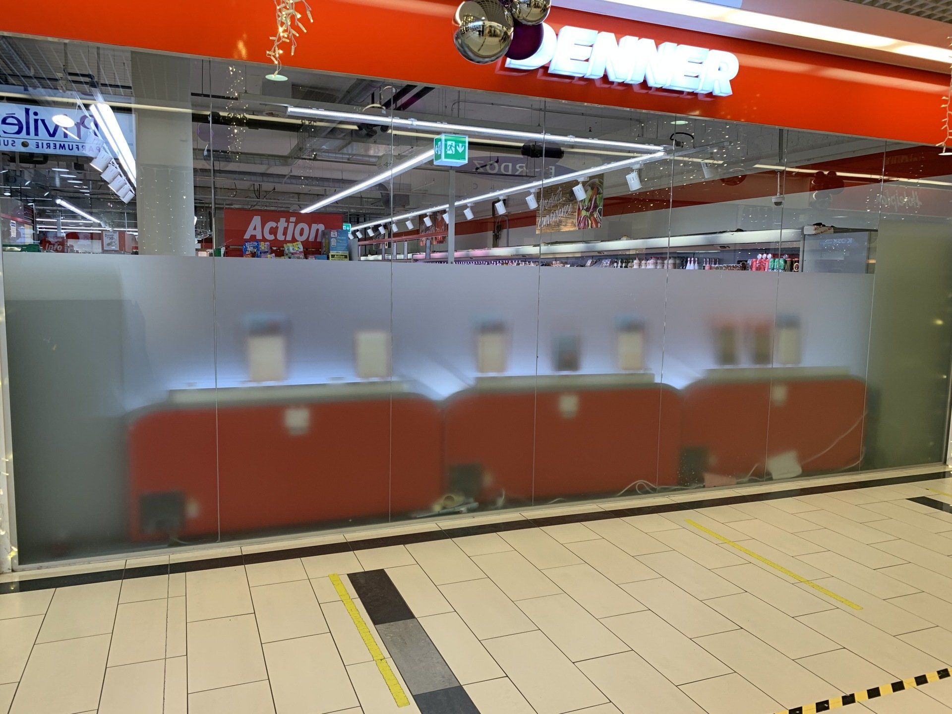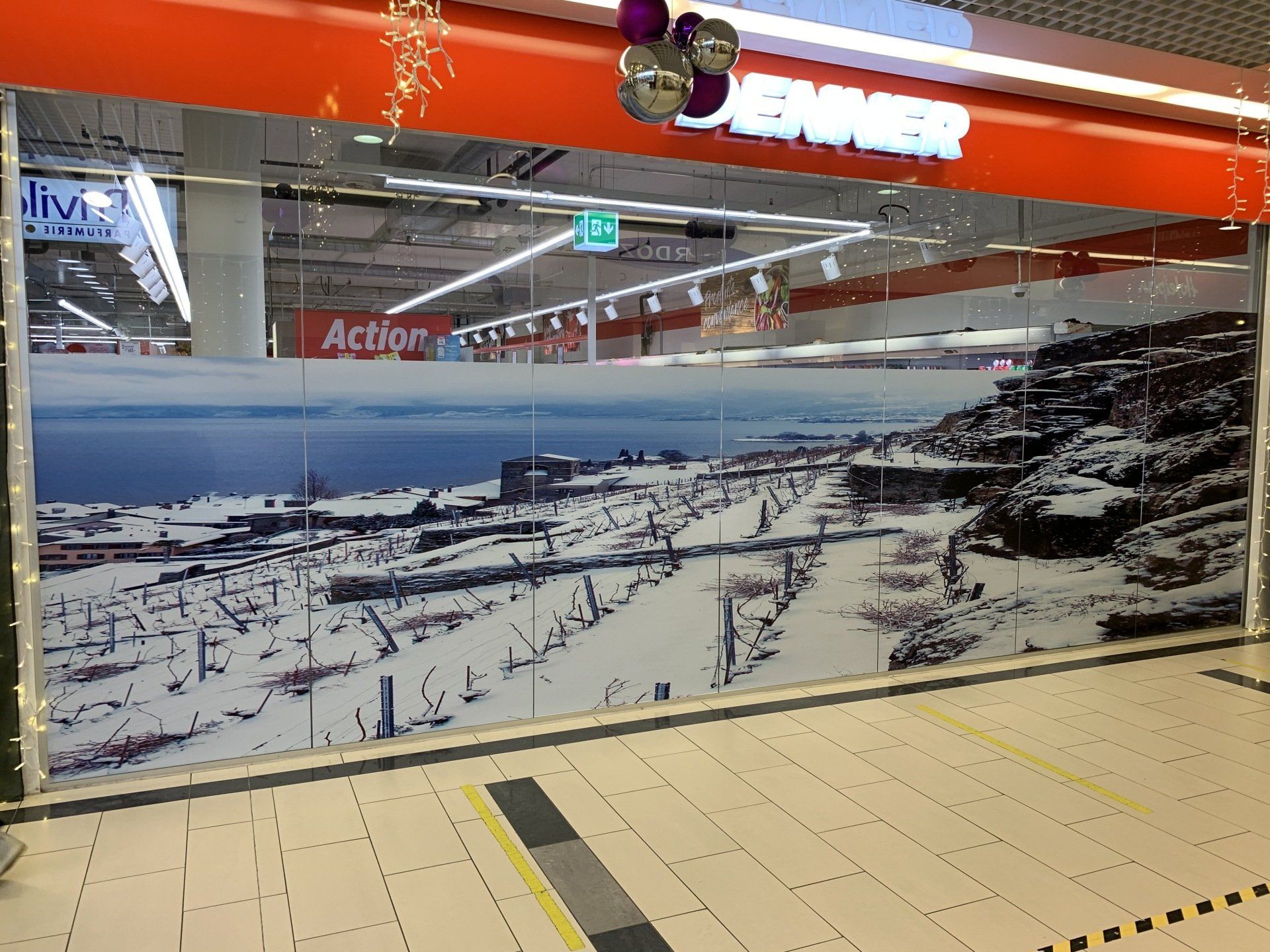 Covering en dépoli imprimé sur la vitrine d'un magasin Denner pour différents événements.