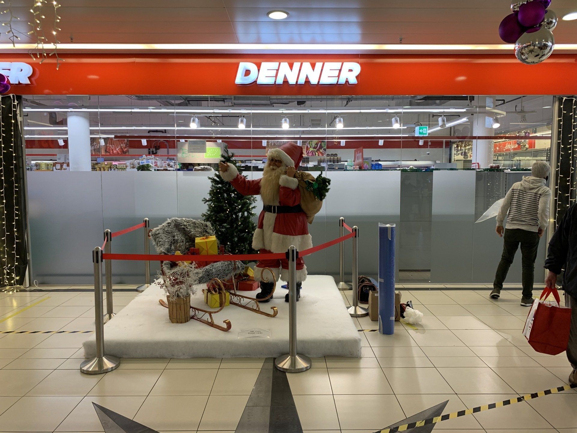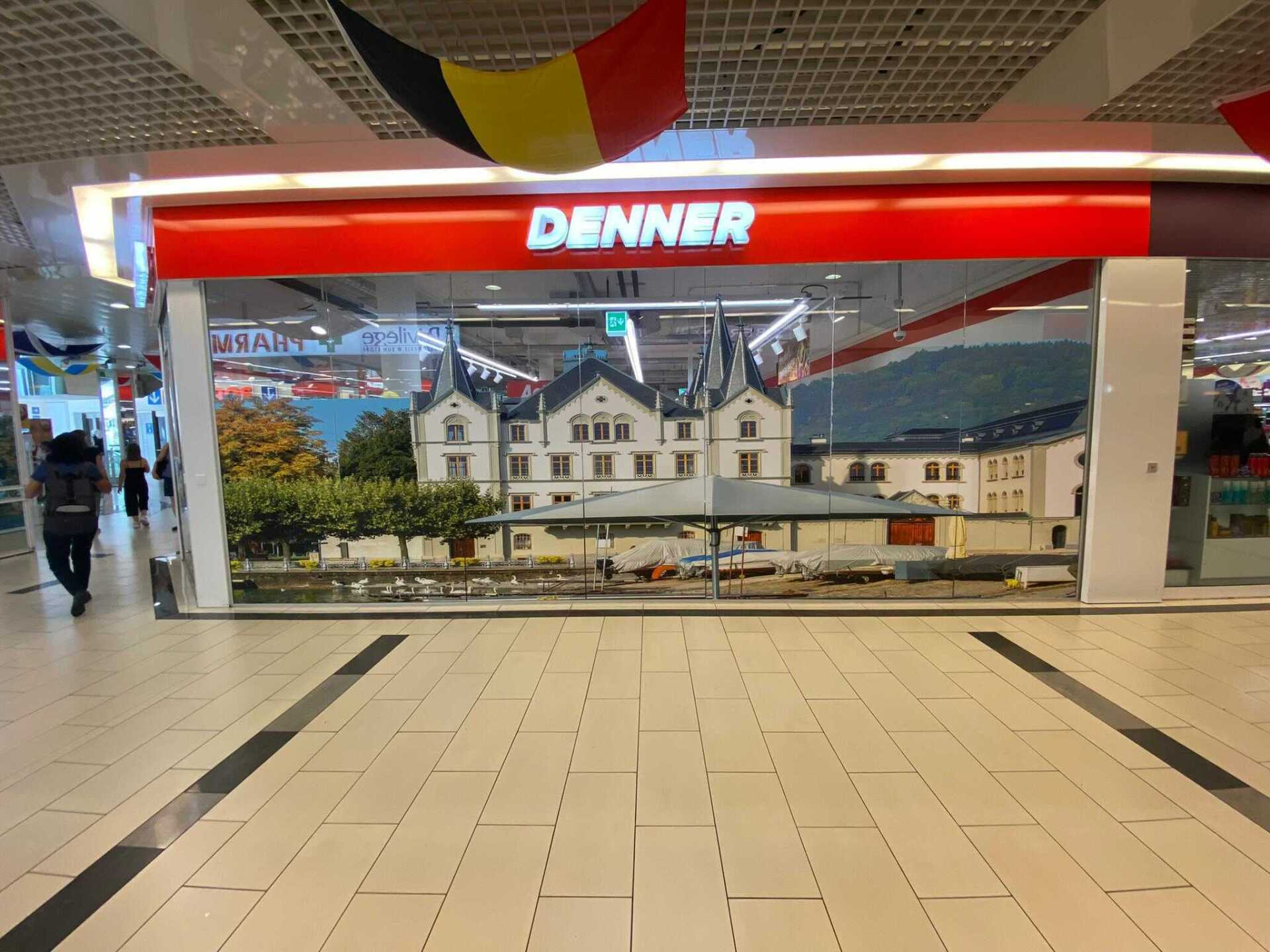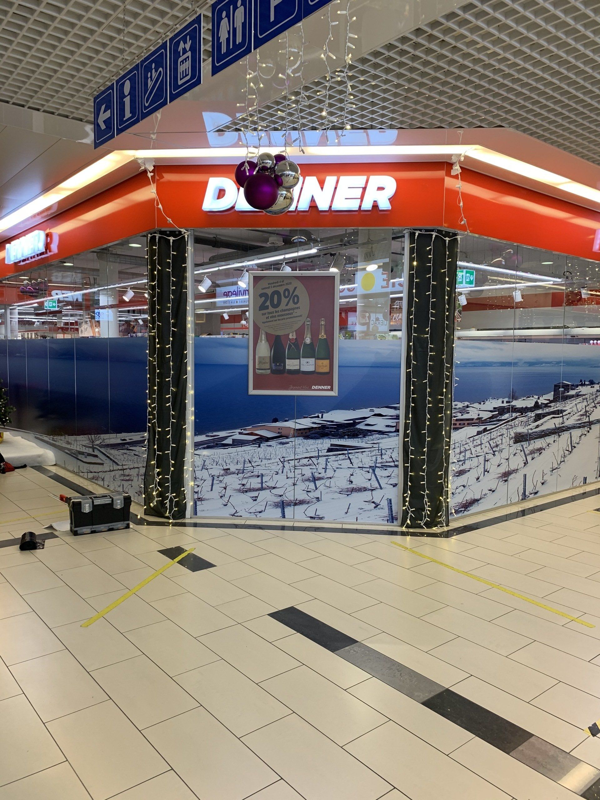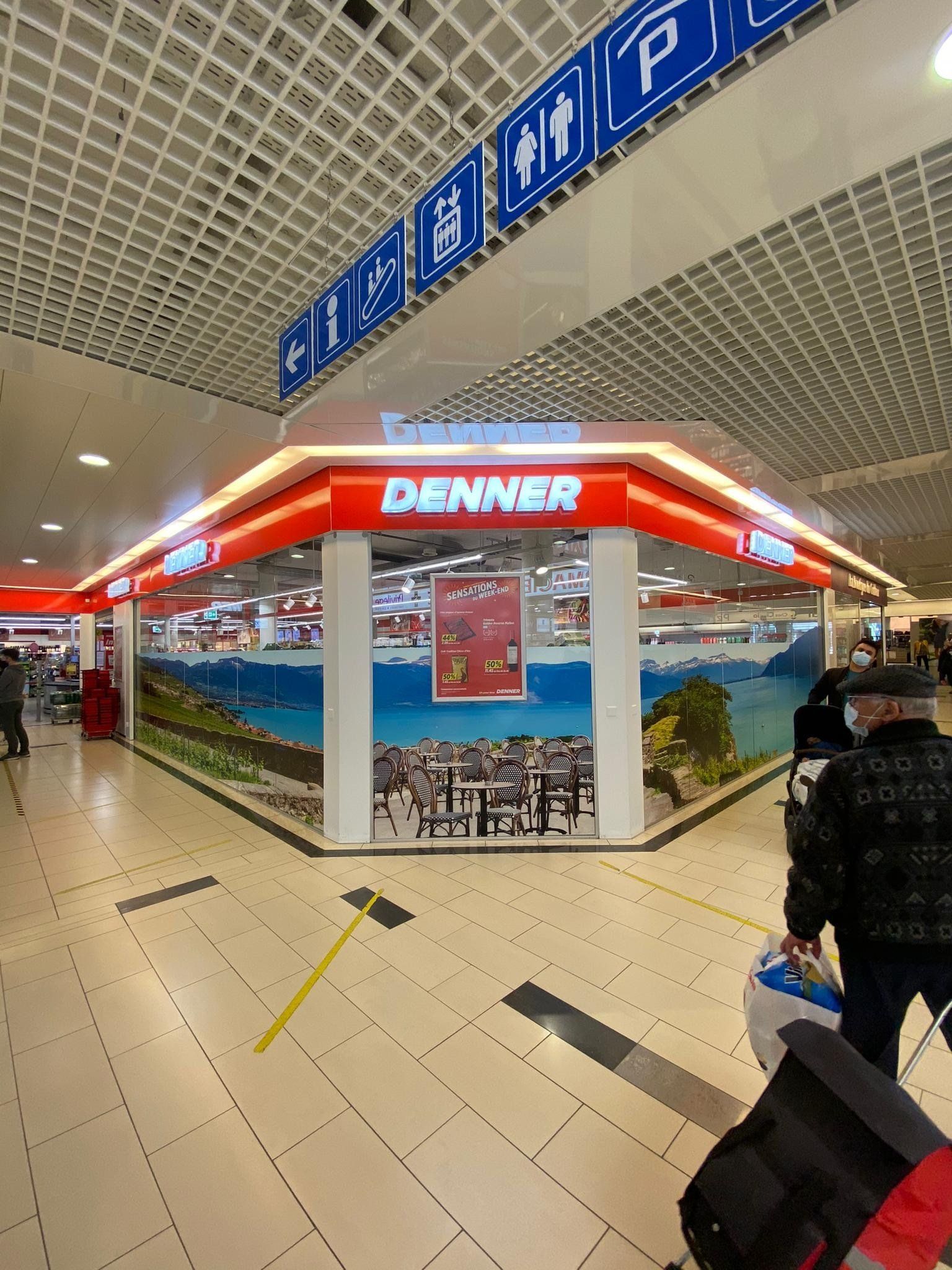 Covering en dépoli imprimé sur la vitrine d'un magasin Denner pour différents événements.